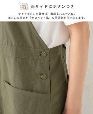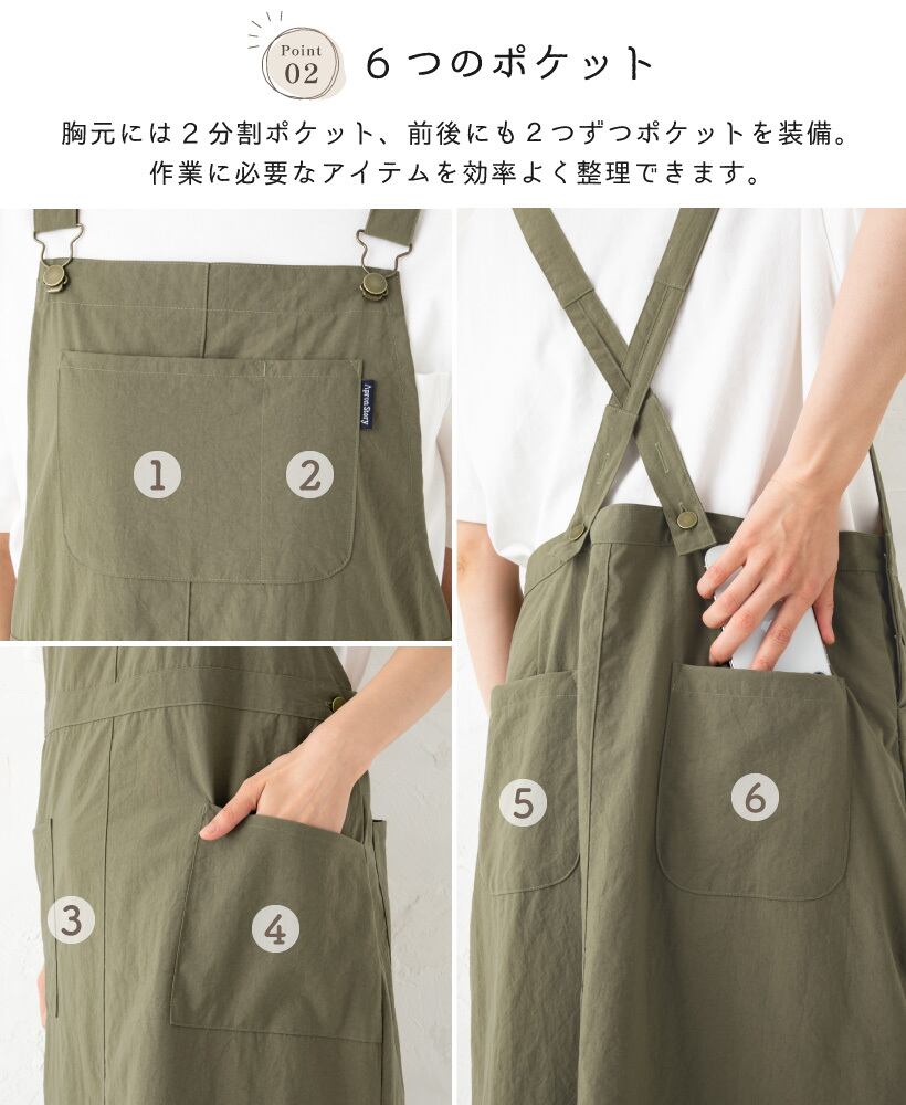 前後どちらから見てもおしゃれ!やさしい色合いのサロペットエプロン。子供っぽくなりすぎないように、やわらかな発色の生地を使用し、カジュアルながらも落ち着きのある印象に仕上げました。調節できる肩紐や動きやすさ重視のスリット、たくさんのポケットなど、機能性もバッチリ。家事・DIY・庭仕事にはもちろん、カフェや雑貨店など接客業の方にもおすすめです。