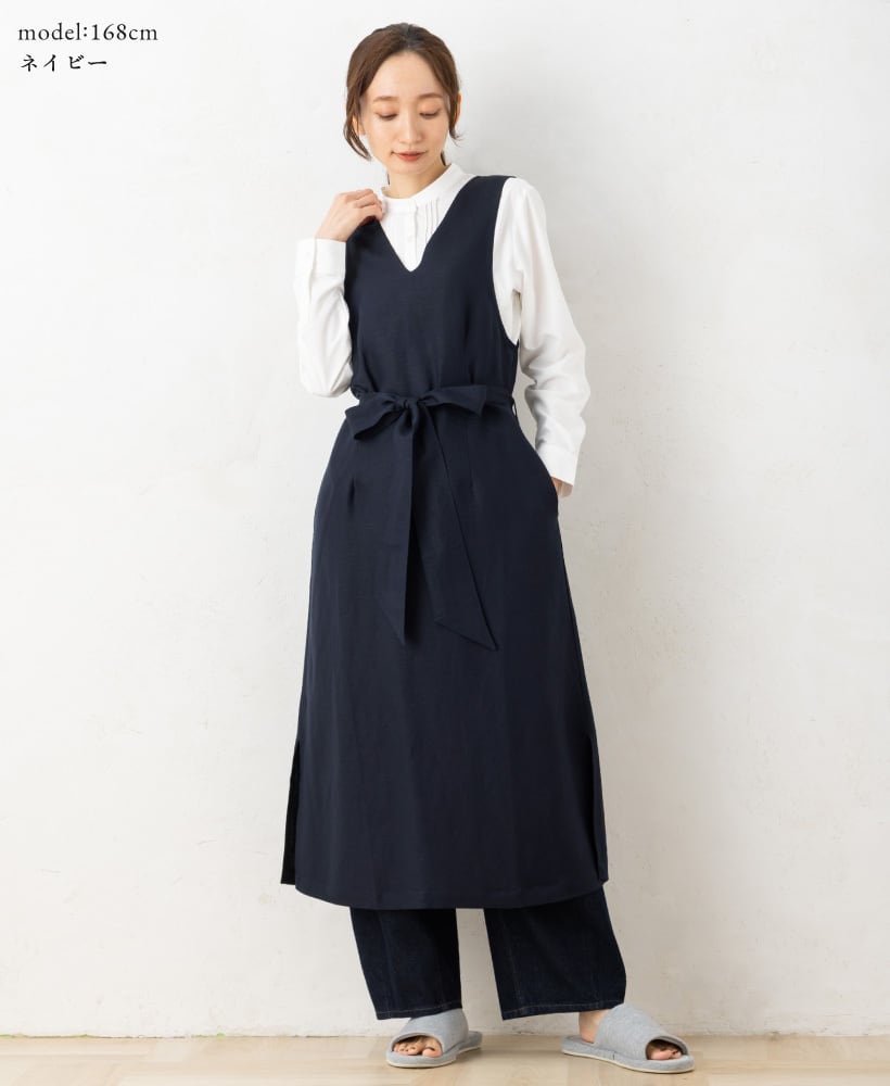ワンピースのような可愛いデザイン!Vネックと太めリボンですっきり見えするクロスエプロン。さらりとやわらかな肌ざわりのレーヨンリネンを使用しており、ロング丈でも軽く、上質な着心地です。動きやすいように足元にはスリットを入れ、ポケットも悪目立ちしないスリットポケット仕様に。着心地にもデザインにもこだわりを詰め込みました。暮らしに寄り添うリネン素材専門ブランド『UNDEUX RIRE(アンドゥリール)』が手掛ける高品質な日本製エプロン。ギフトやプレゼントとしてもおすすめです。