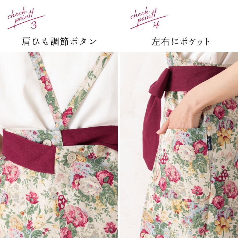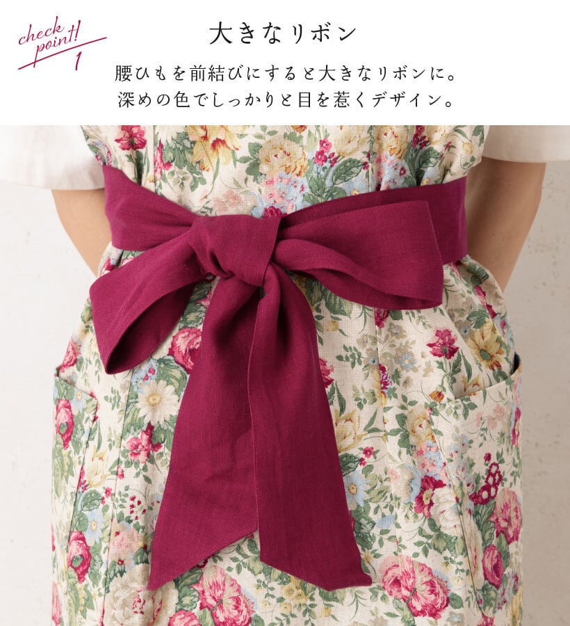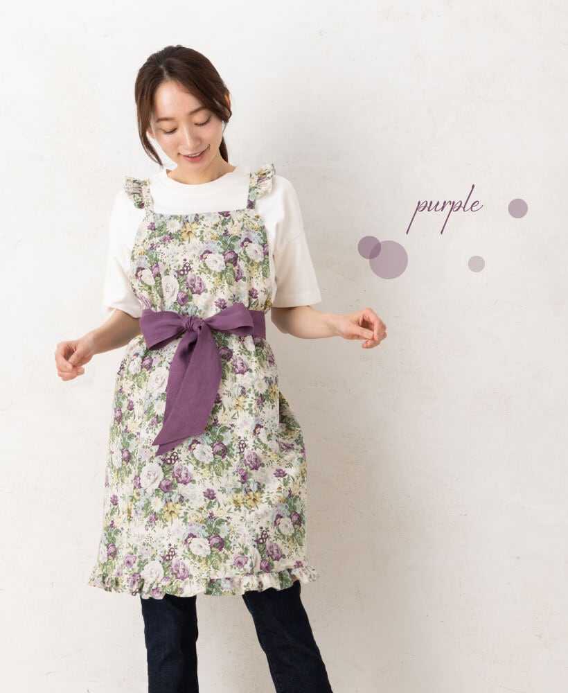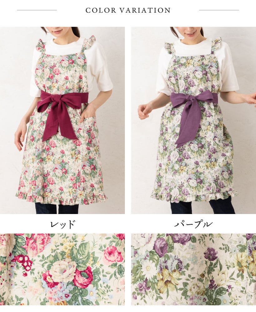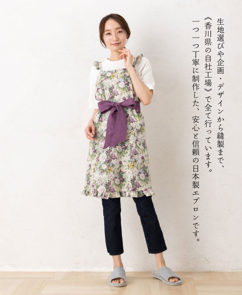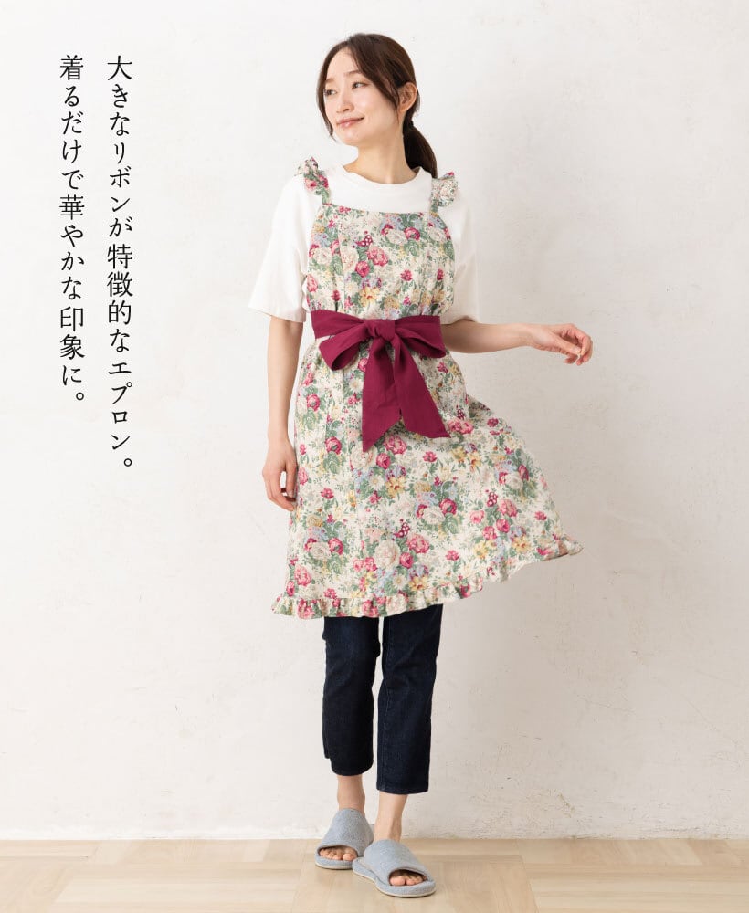 腰ひもを結ぶと大きなリボンに!花柄フリルクロスエプロン。着るだけで華やかな印象を与える花柄に、深めのカラーでしっかりと目を惹くリボン。肩ひもと裾の部分には小さなフリルがふわりと可愛い♪肩ひも調節ボタンや左右のポケットなど機能性もバッチリ◎香川県の工場で1枚1枚丁寧に縫製する、高品質な日本製エプロンは自分用にはもちろんギフトやプレゼントにもおすすめです。