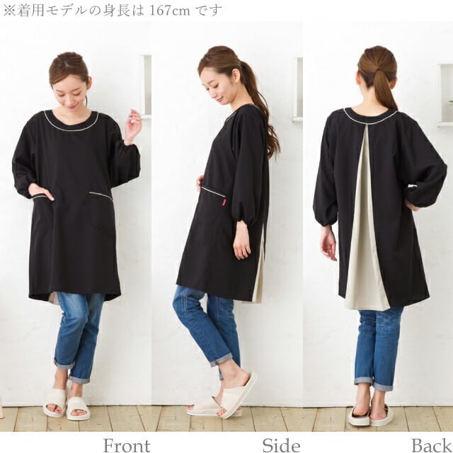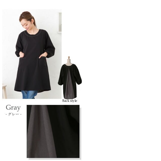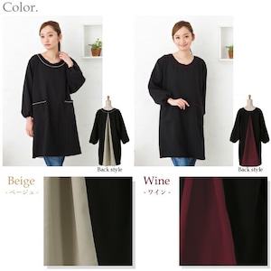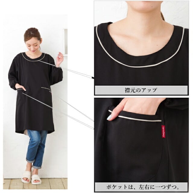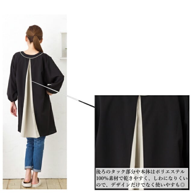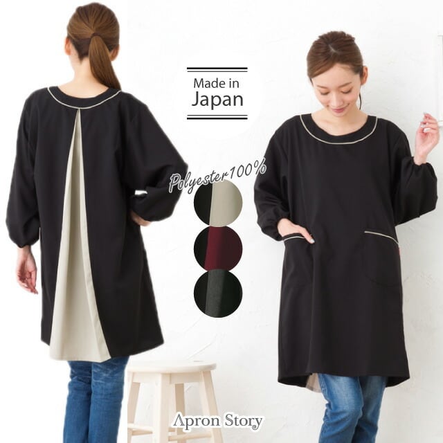 ラウンドネックの首元と、後ろの切り替えデザインがおしゃれでかわいい割烹着。ポリエステル素材なのでストンとしているのと、大きめに開いたラウンドネックがスッキリ見えるデザインの割烹着です。襟ぐりが大きめなのと後ろにタックがあるためスッポリと被るだけで簡単に着れます。ポリエステル素材の部分はしわになりくいのと、乾きやすいので、お仕事や家でも長時間着用する方に人気の素材です。ポケットは左右に1つずつ付いています。後ろが隠れているデザインは、下に着るものを選ばないのと、おしゃれなワンピースみたいに着れて、ちょっとそこまでの外出もしやすいと人気の型です。きれいなラインが出るようにデザインやサイズ感にこだわった、丁寧な作りの日本製エプロン。工場直営のエプロン専門店ならではの高品質エプロンは、ギフトやプレゼントにも人気です。