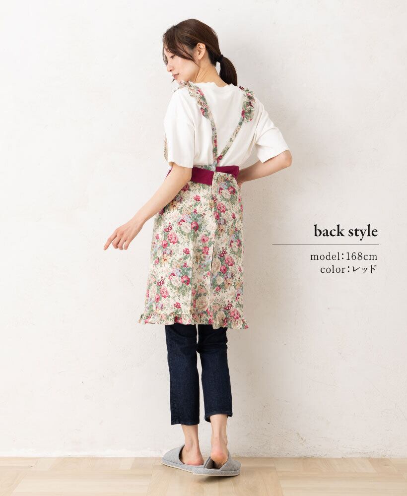 腰ひもを結ぶと大きなリボンに!花柄フリルクロスエプロン。着るだけで華やかな印象を与える花柄に、深めのカラーでしっかりと目を惹くリボン。肩ひもと裾の部分には小さなフリルがふわりと可愛い♪肩ひも調節ボタンや左右のポケットなど機能性もバッチリ◎香川県の工場で1枚1枚丁寧に縫製する、高品質な日本製エプロンは自分用にはもちろんギフトやプレゼントにもおすすめです。
