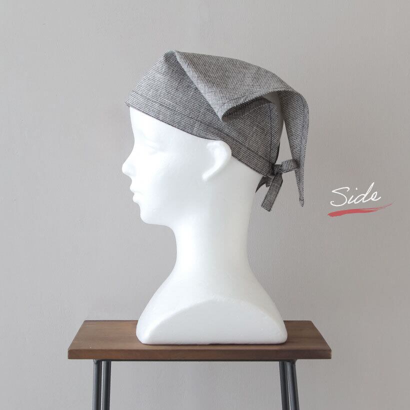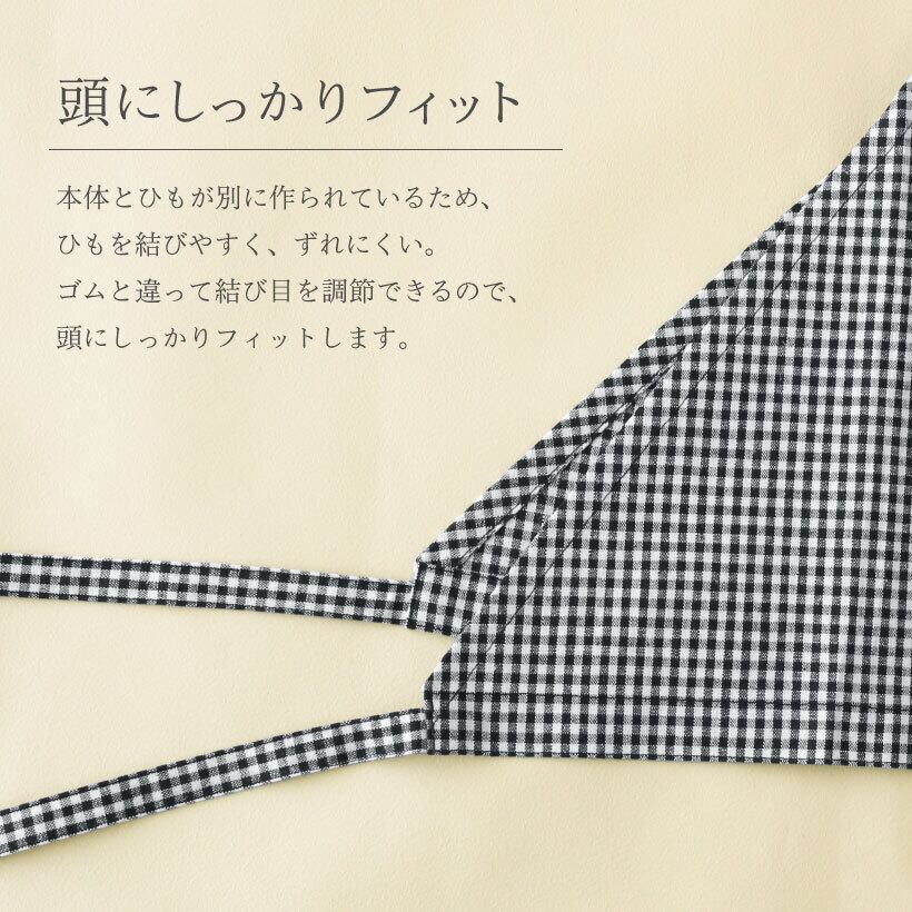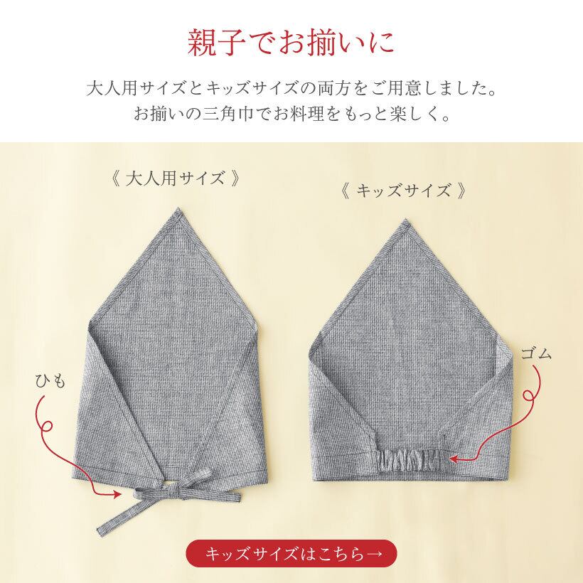 シンプルでどんなエプロンにも合わせやすい三角巾。モノトーンカラーで抑えつつ、総柄でオシャレな雰囲気に。ひもを結んでサイズ調整もバッチリ。柔らかく通気性の良い素材を生地に使用しているので付け心地◎