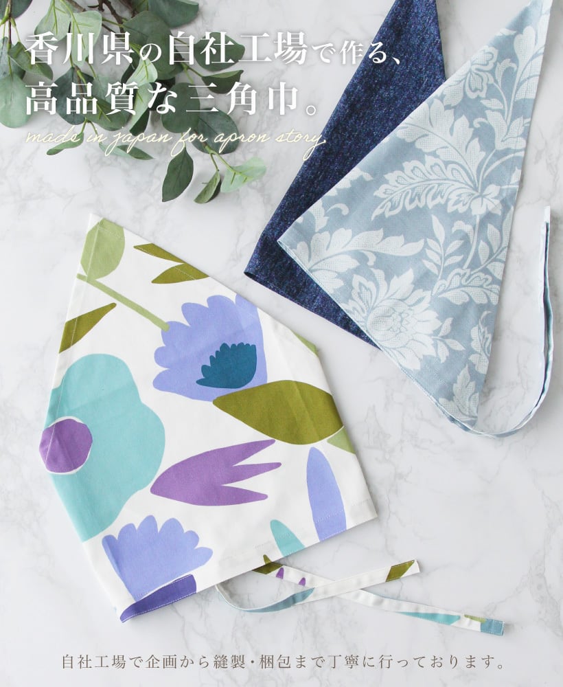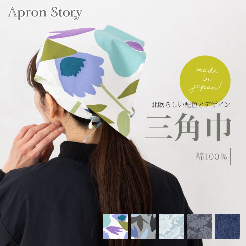 安心の日本製!北欧らしい配色とデザインがおしゃれな三角巾です。三角部分と紐部分が別に作られているため、着用感が良く、結びやすくて、ズレにくいデザインに仕上げました。サイズ感やデザインにこだわった工場直営のエプロン専門店 エプロンストーリー ならではの高品質三角巾は、ギフトやプレゼントにも最適です。