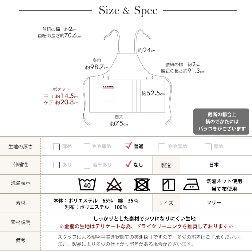 歩くたびにさりげなく見える金襴生地が上品なクロスエプロン。金襴とは、金糸を用いて柄を織り出した織物のことで、数ある布地の中でも最高の位に入る織物です。片側に隠しポケット付きで、さりげなく見える金襴が上品。