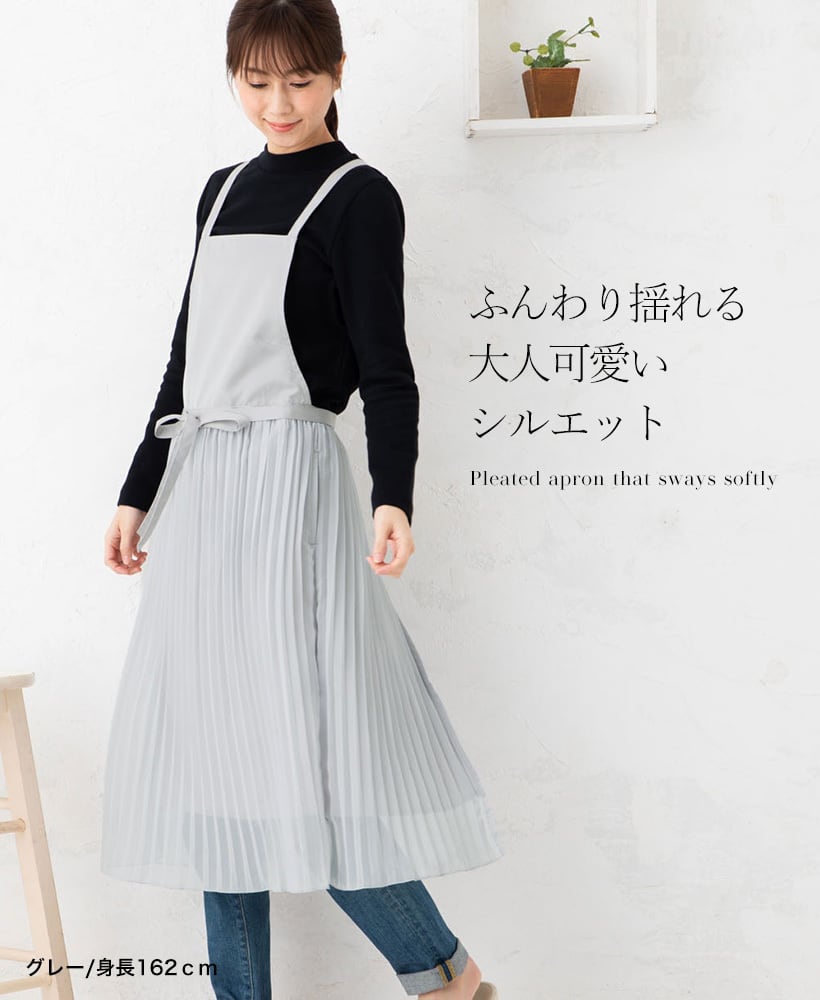 日本製 ふんわりプリーツクロス型エプロン。歩く度にふんわり揺れて上品な大人可愛さを演出。前結びも後ろ結びも出来ます。肩紐は3段階で調節出来るので自分のサイズに調節可能です。 デザインやサイズ感にこだわった、丁寧な作りの日本製エプロン。 工場直営のエプロン専門店 エプロンストーリー ならではの高品質エプロンは、ギフトやプレゼントにも最適です。