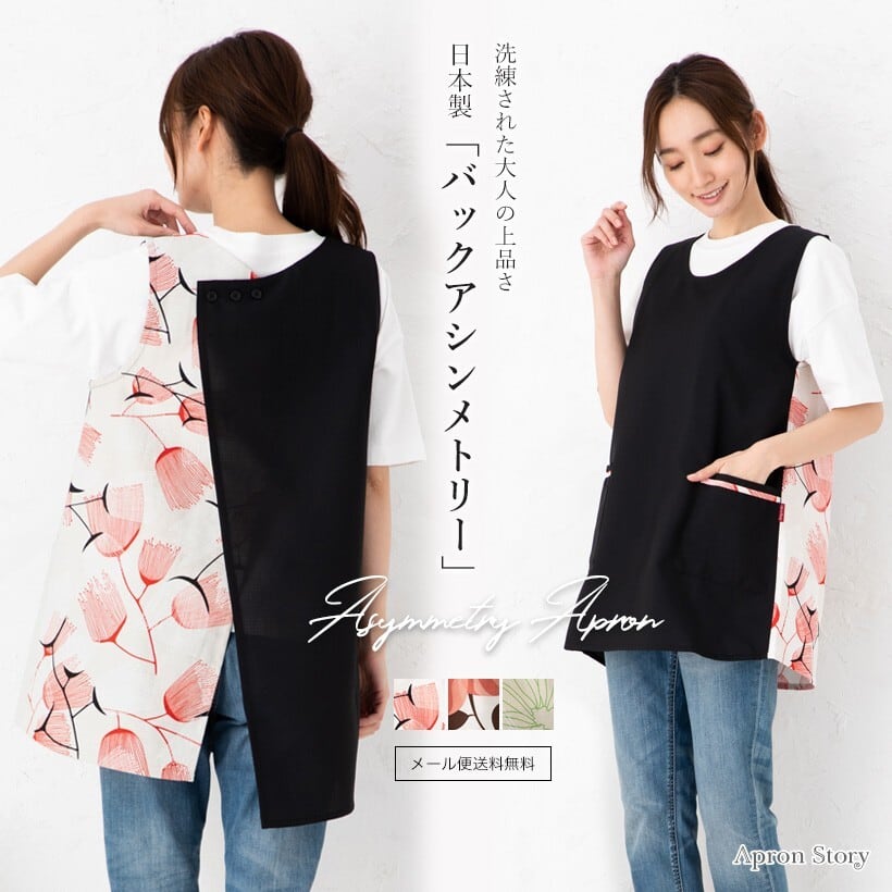 体のラインをキレイに見せてくれる、おしゃれなこだわりデザインのカバーエプロン。左右に大きめのポケット付きで、使い勝手も◎ バックデザインがアシンメトリー仕様で、おしゃれに体型カバーも♪ デザインやサイズ感にこだわった、 丁寧な作りの日本製エプロン。工場直営のエプロン専門店ならではの高品質エプロンは、 ギフトやプレゼントにも最適です。