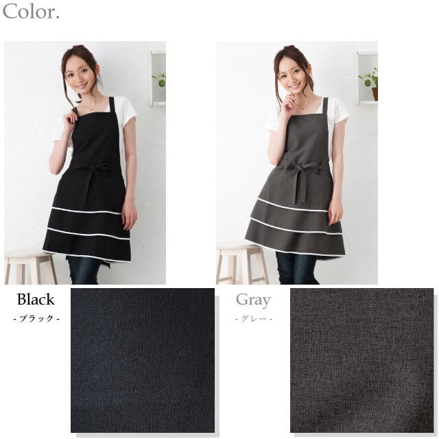 3段のフリルがフェミニンでかわいいエプロン、シワになりくいポリエステル100%の生地でできた、お尻が隠れるデザインでスッキリ見えます、日本製のおしゃれなエプロン。