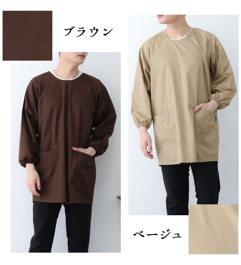 シンプルなデザインがおしゃれな綿ポリの生地でできた男性用割烹着。割烹着は後ろを紐で結ぶだけなので着やすくて、前面に何もないのと、袖口のゴム入りで中の服が汚れる心配がない優秀な作業着です。また綿ポリ素材なのでしわになりくく、ラグラン袖で動きやすい。左右に1つずつのポケット付。また当店の男性用スモックエプロンは、サイズを大きめに作っているため大きいサイズの方着用が可能です。