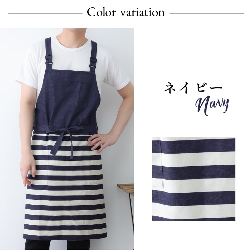人気のデニム素材と、太めのボーダー柄がおしゃれな男性用エプロン。肩紐はベルトの様に片手で簡単に調節ができる、クロスエプロン。日本製のデニム素材を使用したこだわりの高品質のエプロンは、工場直営のエプロン専門店だからできる、丁寧な作りの日本製エプロンです。当店の男性用エプロンは、身幅を大きめに作っているため大きいサイズの方でも楽に着用が可能です。