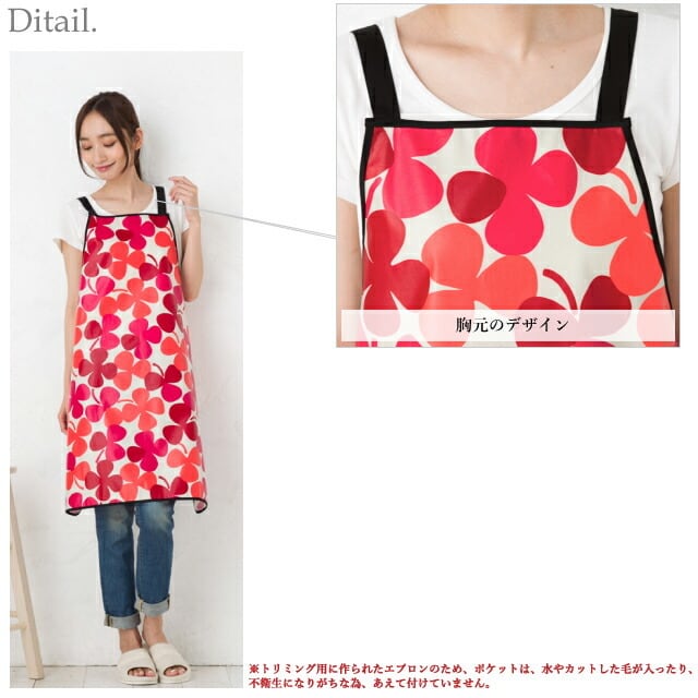 水や油などの汚れに強い、表面にPVCビニール加工の施された生地でできた、カラフルなクローバーのデザインがかわいいトリミング用エプロン。トリミングの際にトリマーさんの使い勝手を考えて、クロスタイプの肩紐で負担を軽減し、水や、カットした毛が入り、不衛生になりがちな、ポケットはあえてつけていません。着用方法が、肩紐を両方のDカンに通し、結ぶだけでなので簡単で楽ちん。