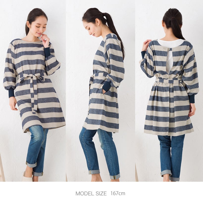 女性用は取り外し可能な腰紐が付いて、二通りの着方が楽しめる、ボーダー柄がおしゃれなリブ付かっぽう着