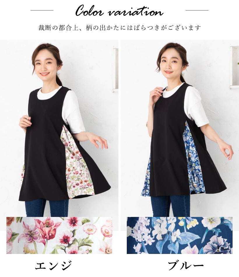 動くたびに見えるサイドの花柄がとってもおしゃれ♪ 体のラインをキレイに見せてくれるAラインのカバーエプロン。