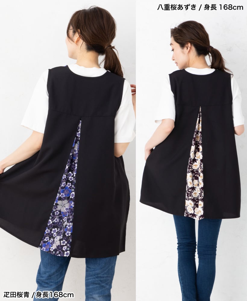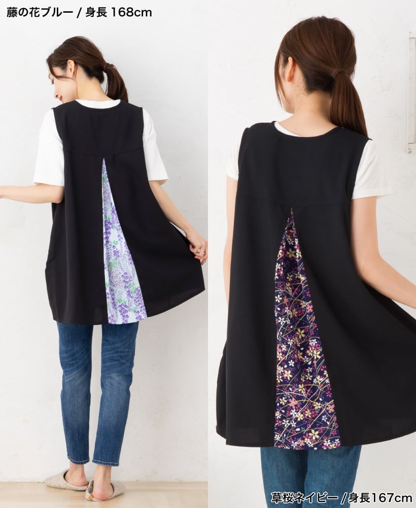 \高品質&日本製/着たままお出かけもできる、後ろからひらりとみえる上品な和柄が印象的◎な、和柄カバーエプロン。面倒な腰紐や、ボタンがないので上からかぶるだけで着用できます!。軽い・速乾性がある・シワになりにくいポリエステル生地を本体に使用し、日常的にも使いやすく、母の日のプレゼント・ギフトとしてもおすすめです。