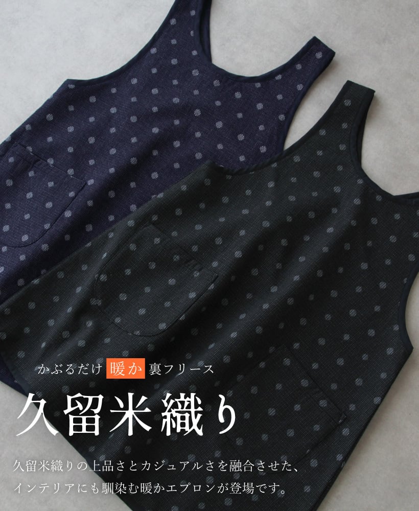久留米生地を使った上品なドット柄の暖か裏フリースエプロン。面倒なひもやボタンがなく、かぶって着るだけ。ショート丈なので、足まわりが動きやすく、ガーデニングなどの作業もスイスイ。薄手でモコモコせず、着ぶくれしないのでちょっとしたお出かけも。香川県の工場で1枚1枚丁寧に仕上げる、高品質な日本製エプロンはギフト・プレゼントにもおすすめです。