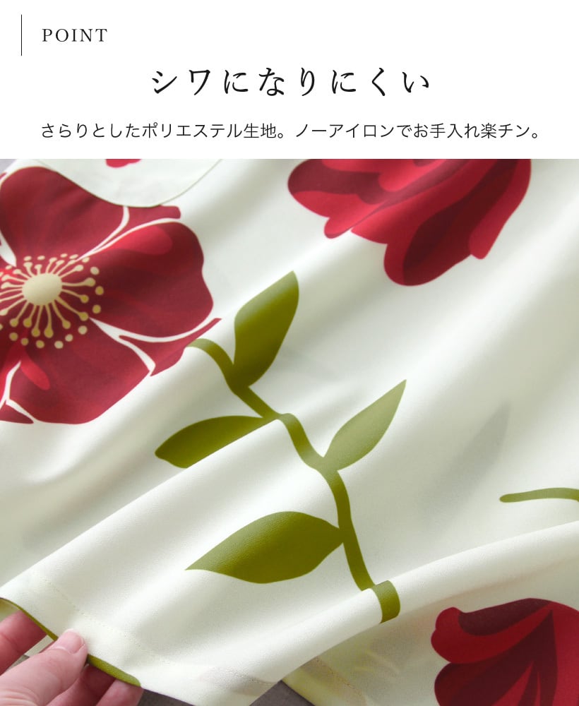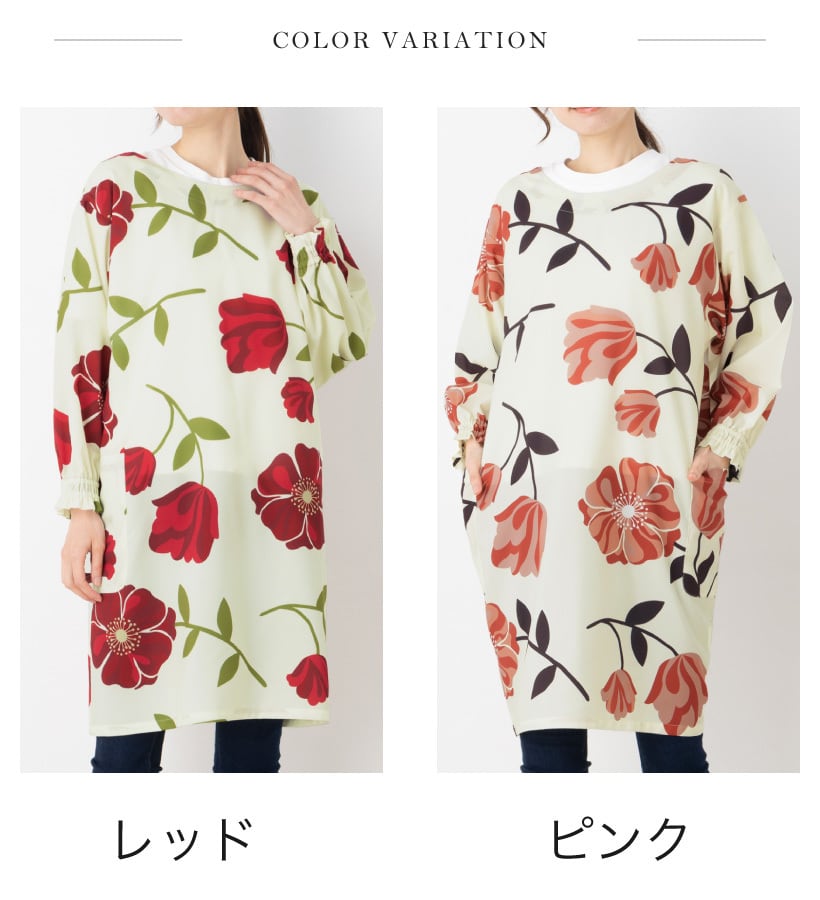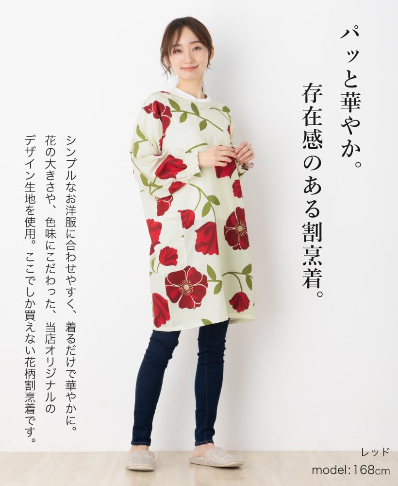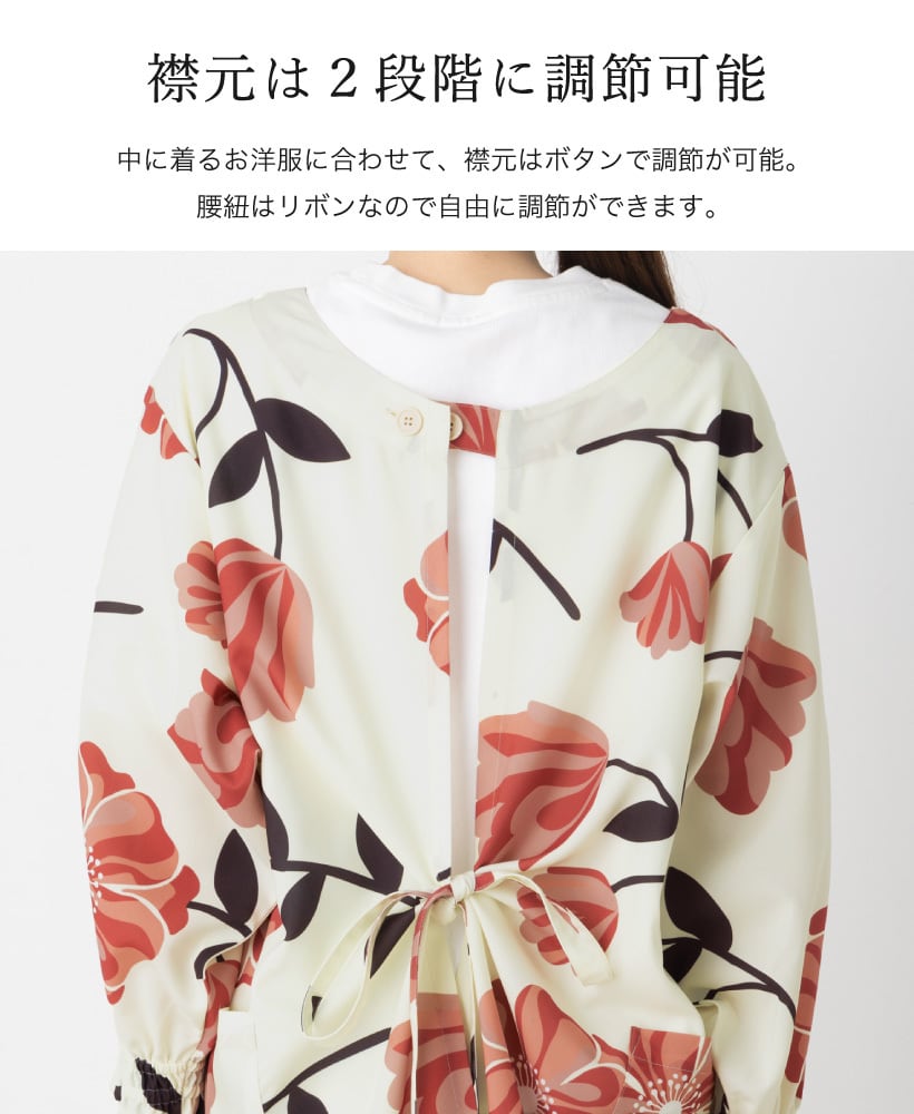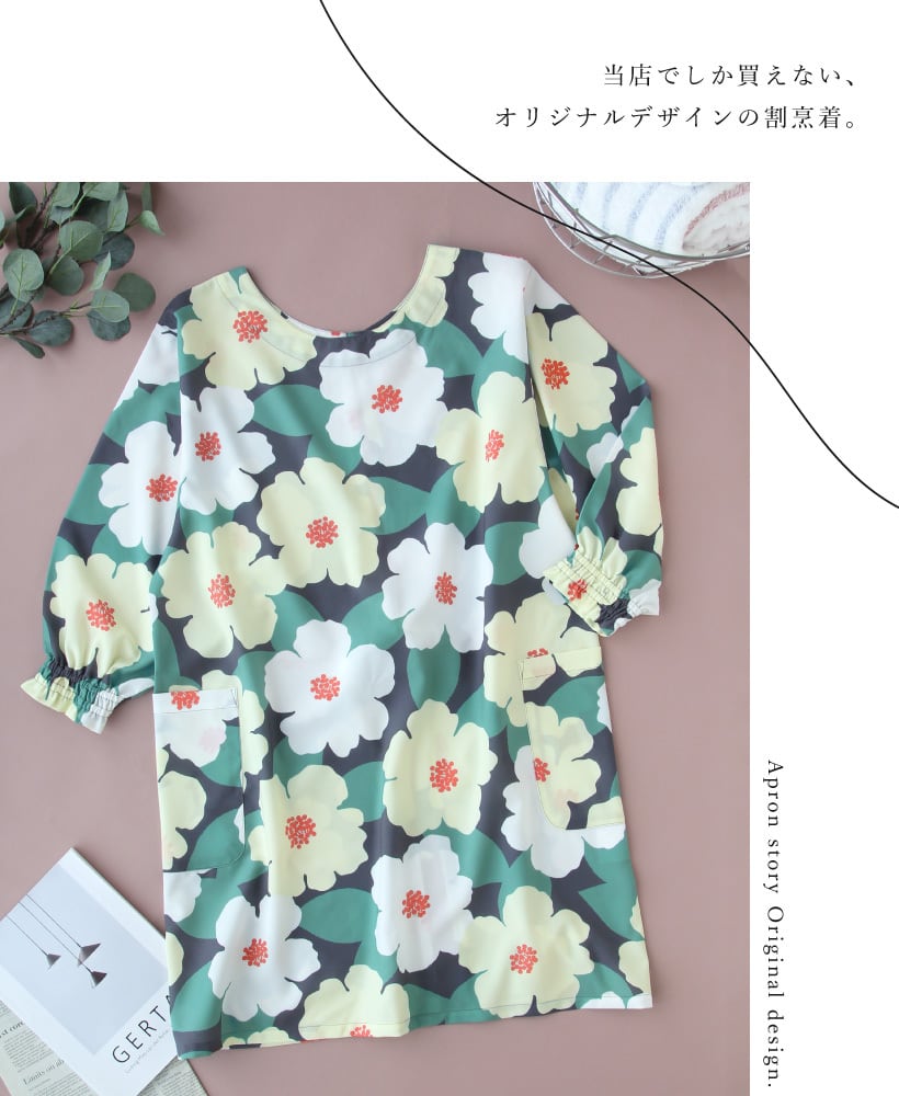 ここでしか買えない当店オリジナル!大胆な花柄の、パッと華やかな存在感のある割烹着。さらりとしたポリエステル生地は動きやすく、シワが目立たないのでお手入れも楽チン。全体的にゆったりとした着心地で、中に着る服を選びません。袖口はシャーリングの可愛らしいゴム袖。作業時も袖がずれ落ちにくく安心です。
