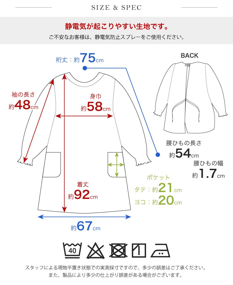 ●静電気が起こりやすい生地を使用しています。ご不安な方は、静電気防止スプレーの併用をお勧めいたします。