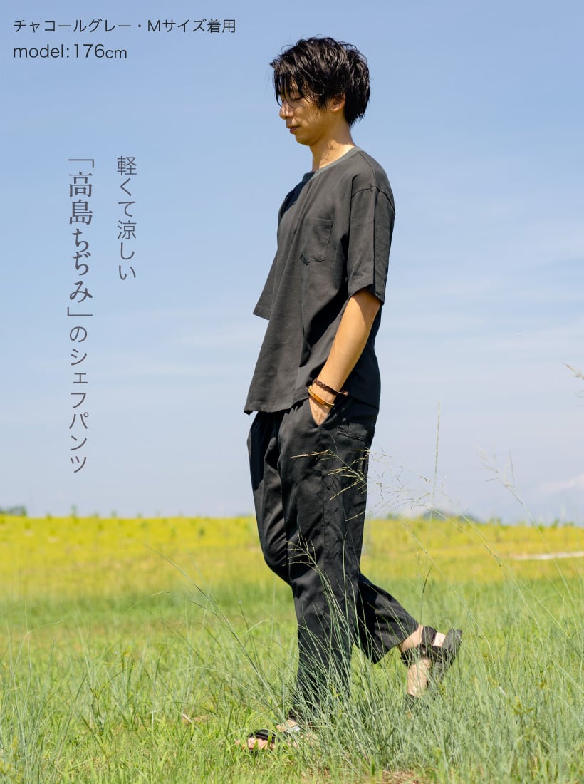 高島ちぢみを使ったシェフパンツ。シンプルな無地で、外出着としても着用できるようなデザインにしあげました。高島ちぢみ特有のシボによって、肌への接着面が少ないため風通しが良く、さらっと快適。蒸し暑い夏の暑さを快適に過ごせます。